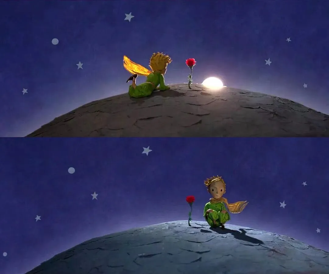 小王子与玫瑰花的段落,作者 圣·埃克苏佩里将这种朦胧的爱意写得太美,不是刻意用语言雕琢的美感,这种美是从在童话的浪漫意境中生出来的,但你也能一眼就看到现实。