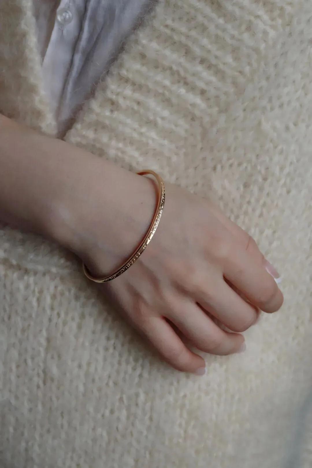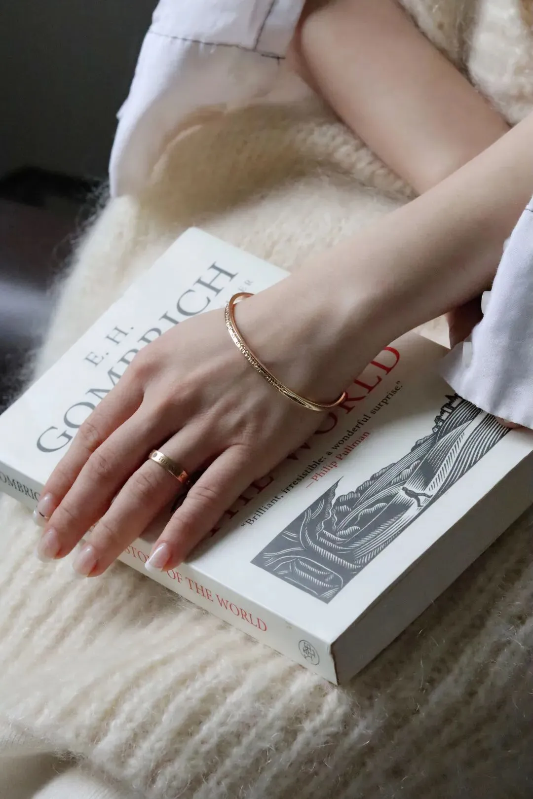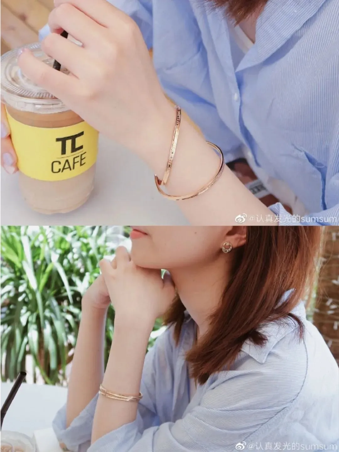 手镯材质采用 925银镀16 k 金,抛光电镀玫瑰金,色泽明亮且不容易掉色,于手腕间折射出细腻的光泽,不仅显白且能衬托优雅高贵的气质。