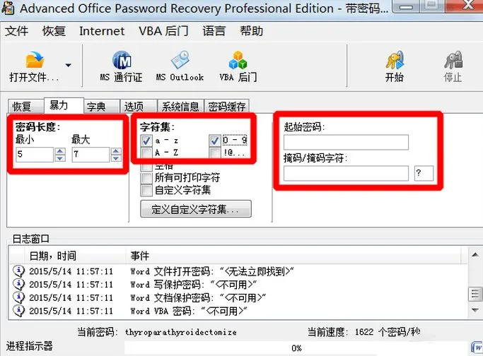 2.然后单击“开始”按钮,在开始在指定范围内破解,这样成功率更高,速度更快。比如下图就是定义字符集后成功破解的Word文件密码。