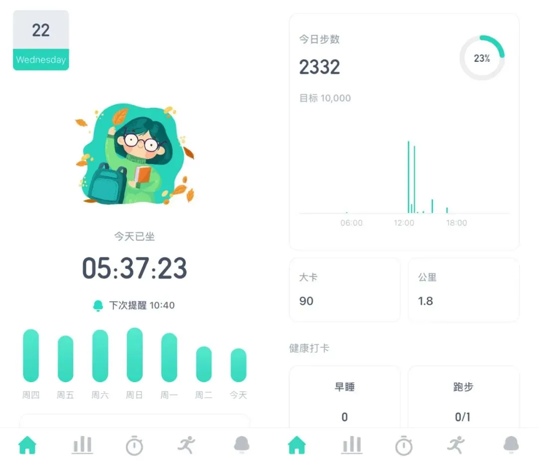 App 支持高度自定义,可以根据学习和工作的安排,去设定星期几到星期几开启久坐提醒。