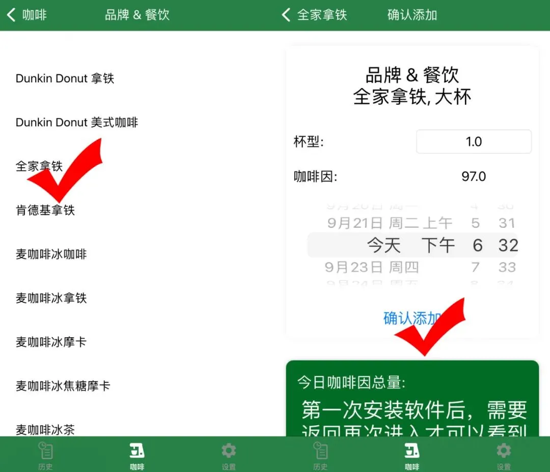 每次喝过什么饮料,选中相应的,点击「确认添加」就行。