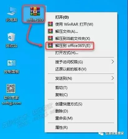 1.鼠标右击【office365】压缩包选择【解压到 office365】。