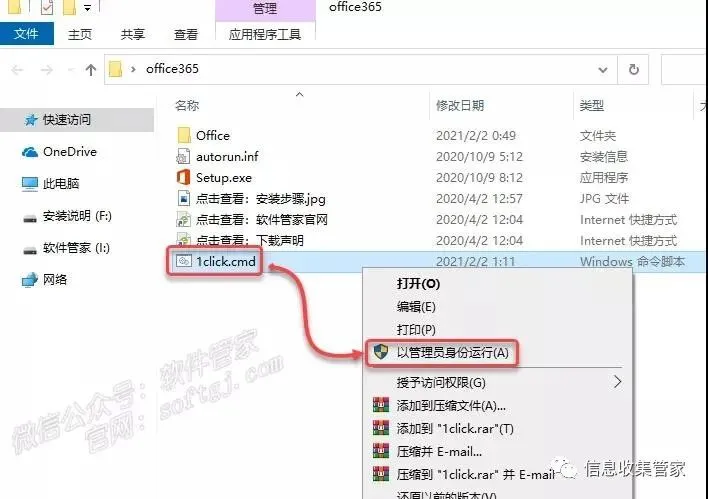 5.打开安装包解压后的【office365】文件夹,鼠标右击【1click.cmd】选择【以管理员身份运行】。