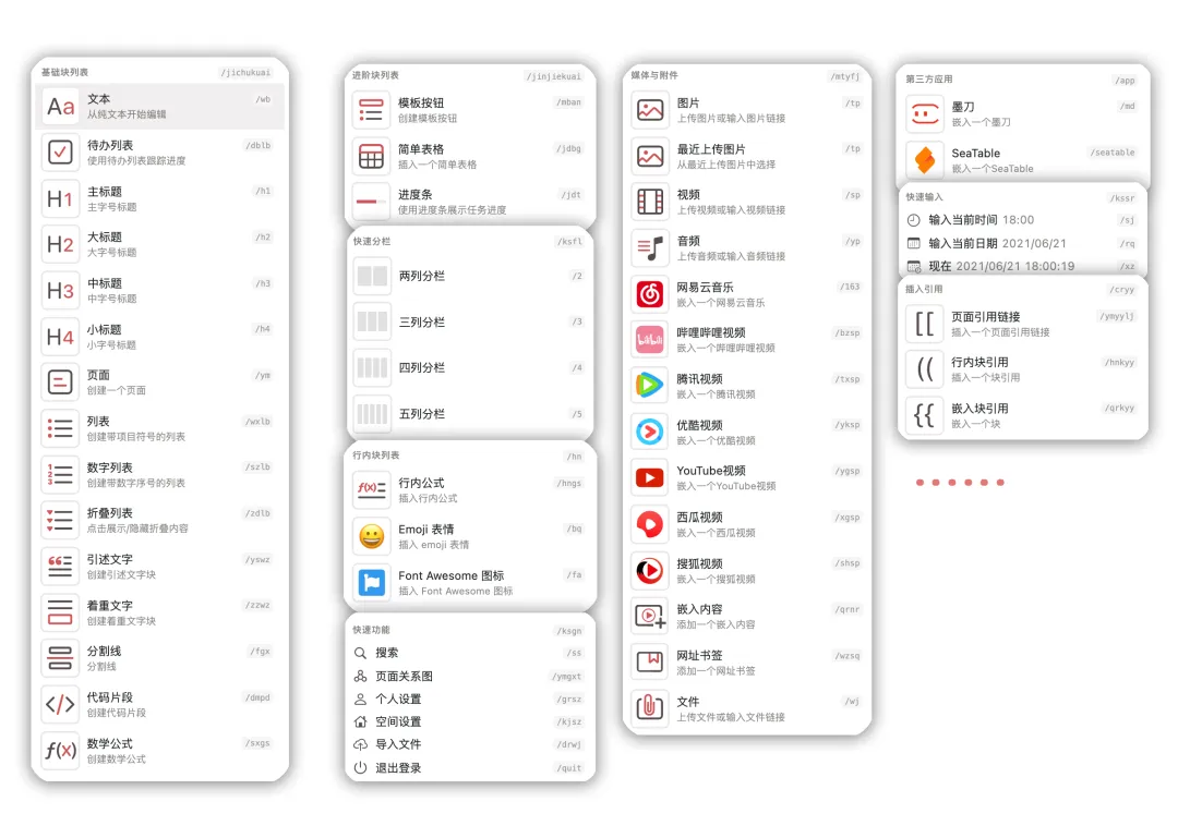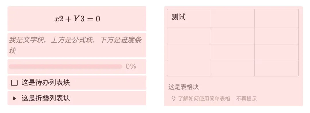 wolai目前有超过30种类型的基础块,常见的有文字块、图片块、表格块、视频块…… 高阶的有代码块、数学公式块、进度条块…… 块的类型还在不断新增中。