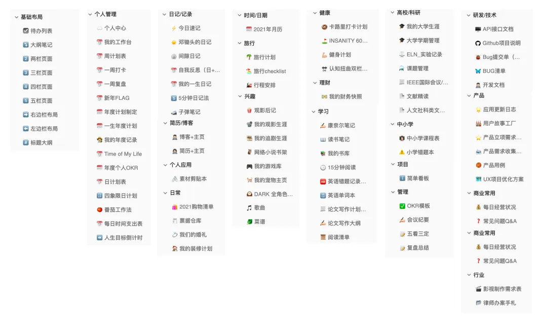 wolai的模板中心中有超过30种类型,上百款模板,涵盖生活、学习、管理、求职、理财等各种场景,可以一键使用;同时3000个Emoji和FontAwesome图标也能随意调用(当然,如果没有合适的,你也可以手动上传图标或者使用外链)。