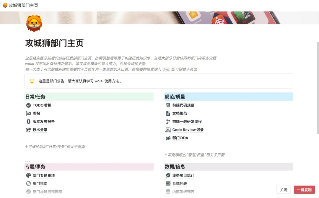 团队和个人使用wolai迅速打造主页,所有的信息按需要排列,方便记录、调整和分享。wolai中的模板中心中有一个叫“攻城狮部门主页 ”的模板,就是一个不错的实操案例。