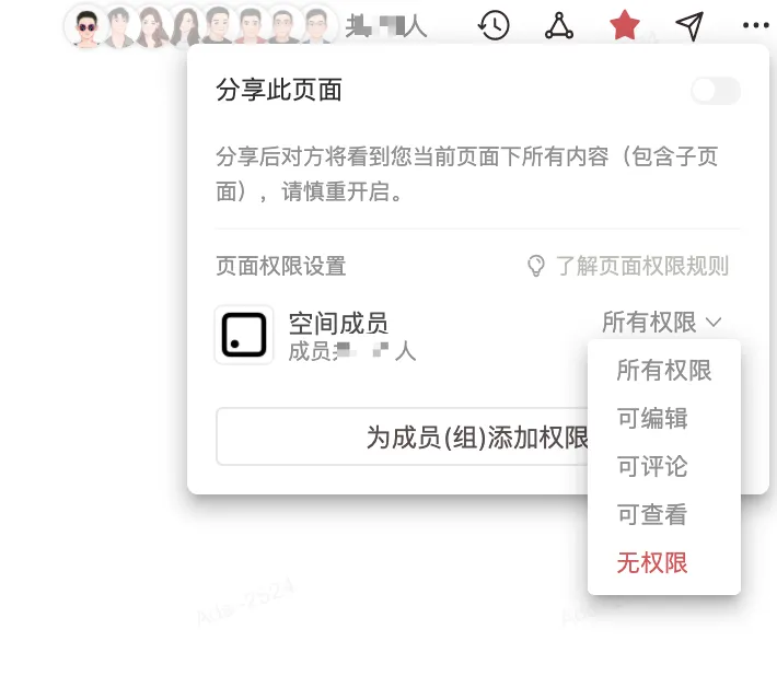 在wolai的团队空间中,可以根据需要为空间所有成员、成员组或者特定成员设置权限(未来可以为所有wolai用户以及任何wolai用户设置权限)。非常方便多人协同和远程工作交流。