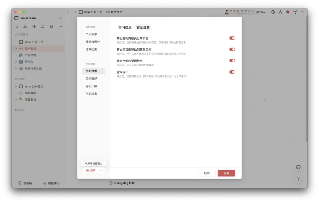 在空间安全上,wolai发布了“退出所有设备”功能,可以一键主动退出所有已经登录的设备,确保账户安全。