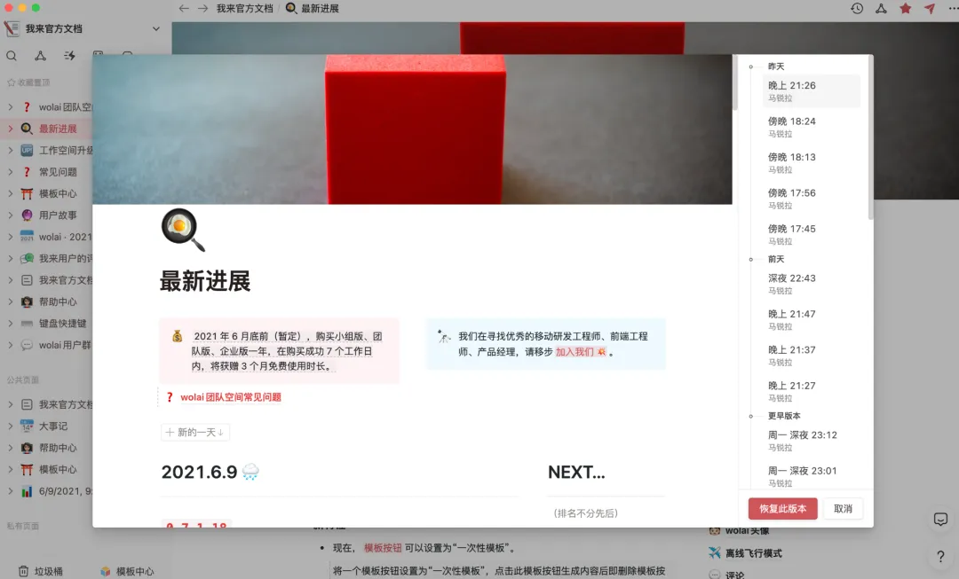 在数据安全上,除了为所有页面定时生成快照——页面历史(当前页面可以恢复到任意历史版本),wolai还可以精确记录页面的每一步编辑历史,以及支持自由回溯。未来wolai还会为所有“块”生成“块快照”……