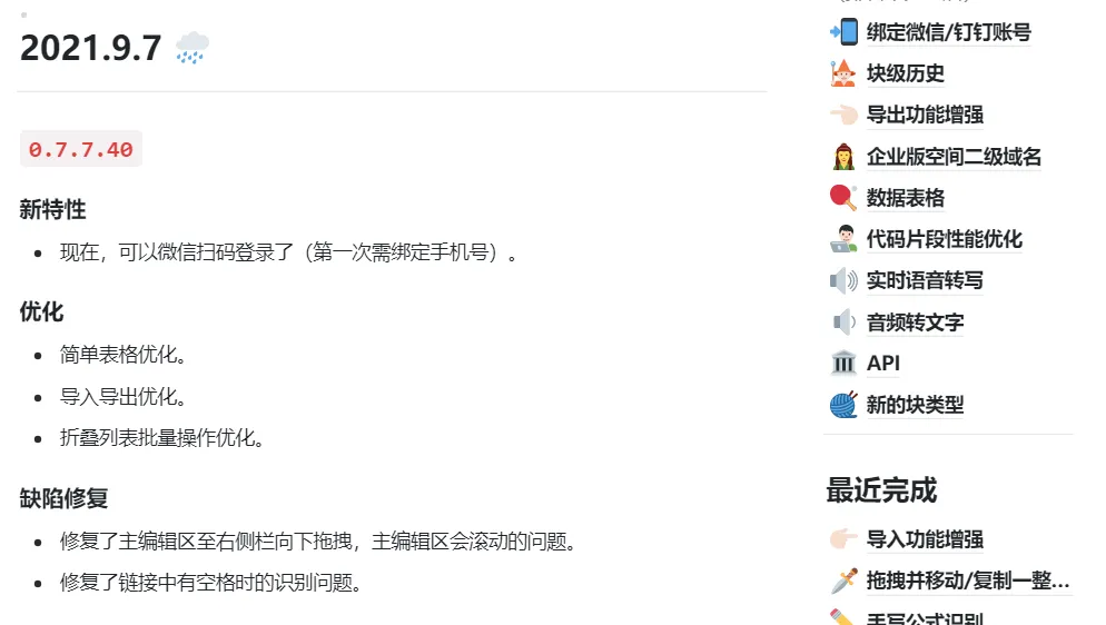 wolai的一个特色就是,几乎每一个工作日你都可以在他们的产品进展中,看到程序员们的工作内容,以及一些小惊喜。最为重要的,很多市面上其他家单独拿出来的收费功能,wolai目前免费提供给用户。比如图片OCR、文字翻译、文字跑马灯、右边侧栏、数学公式手写支持……