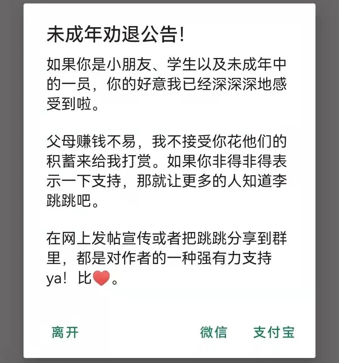 点击「支持作者」,弹出的居然是“未成年劝退公告!”