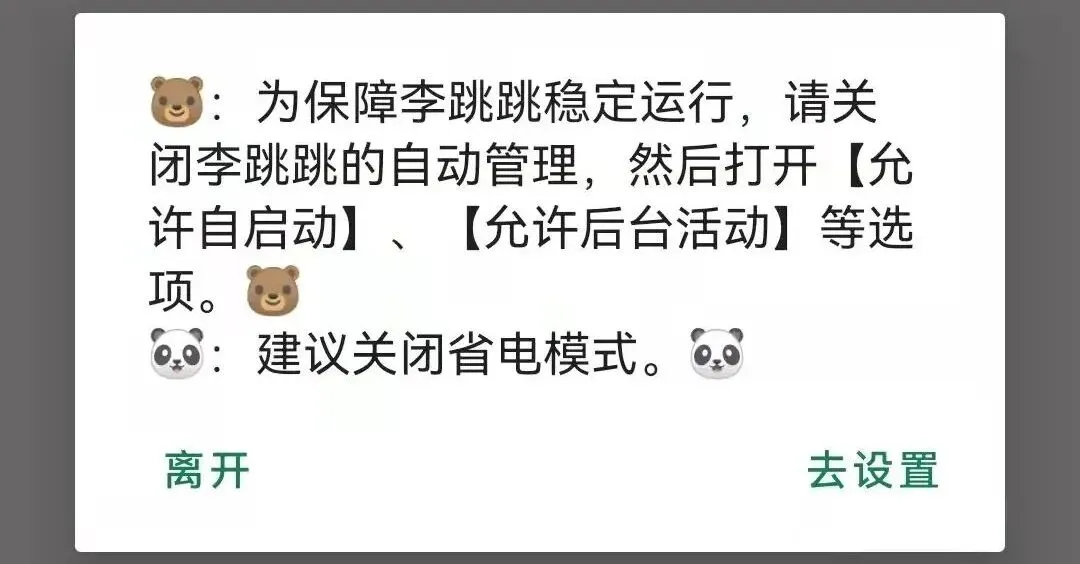 点击弹窗右下角的「去设置」,我的荣耀手机直接打开了手机管家(其它品牌型号手机没测试),打开“应用启动管理”功能,找到“李跳跳”,选择手动管理,在弹出窗口中,打开【允许自启动】、【允许后台活动】两个选项。(操作详见视频 ↓)