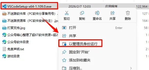 2.打开刚刚解压的文件夹,鼠标右键点击“VSCodeSetup-x64-1.109.0.exe”选择“以管理员身份运行”