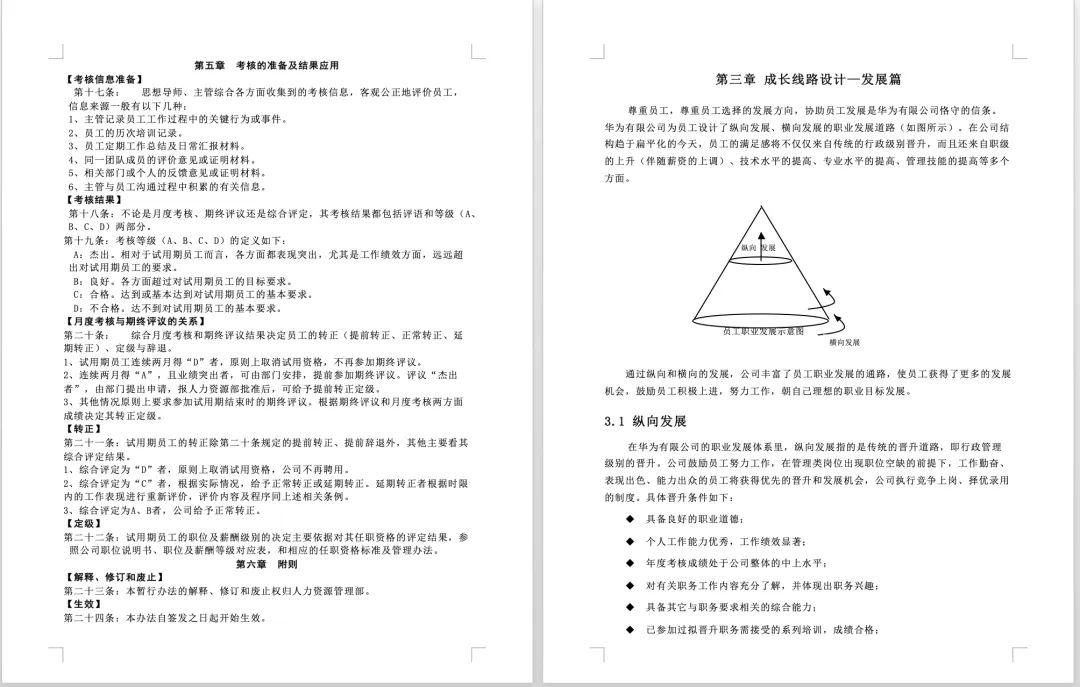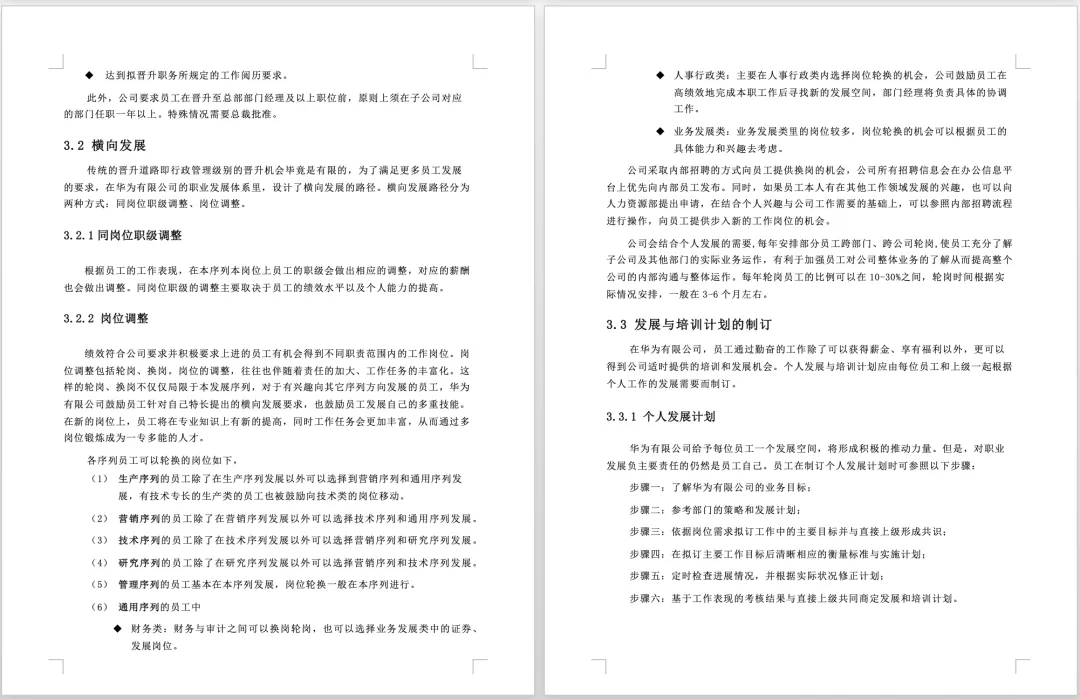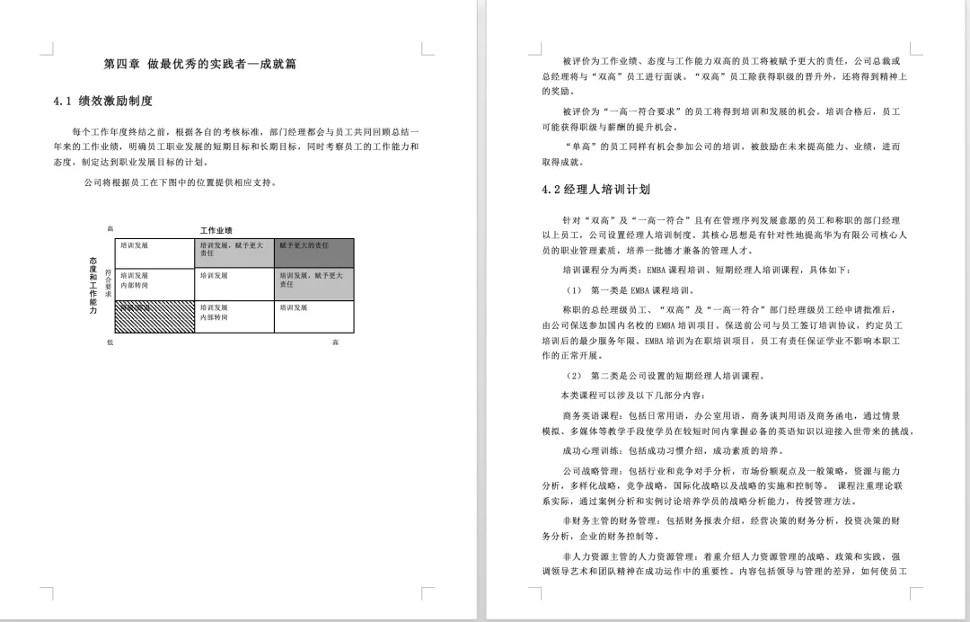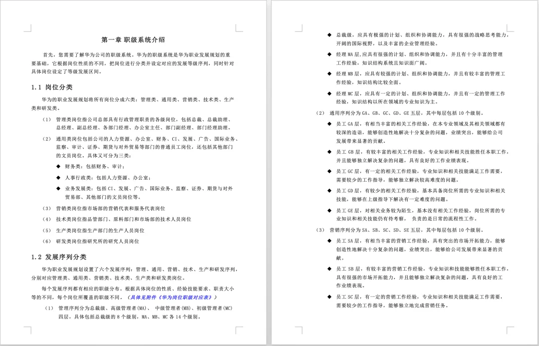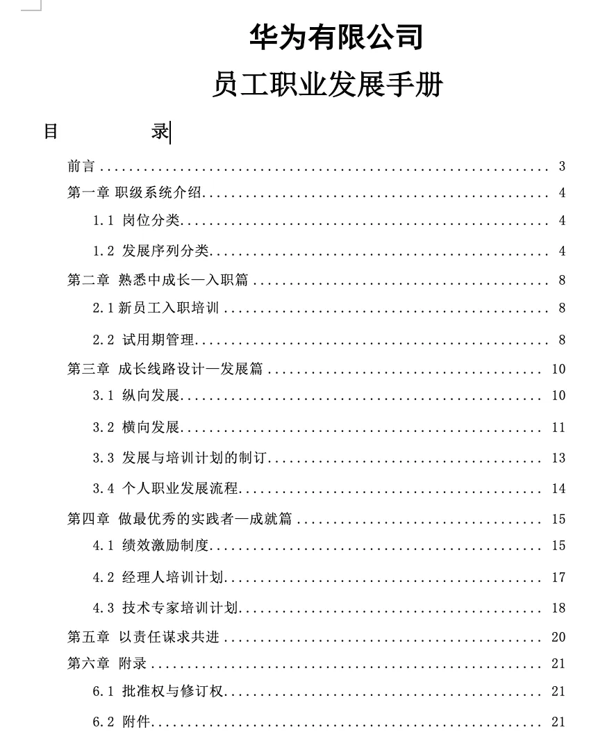 华为员工职业发展手册(word可编辑) 我们说发展员工 其实不是简单给员工升职加薪 升职加薪只是员工得到发展之后的客观效果而非途径 从企业的角度出发 发展员工是为了提高员工解决问题的能力 从而给公司创造更大的价值 如何制定企业的员工发展通道 今天小编带来的免费福利是 《华为员工职业发展手册》 让我们一起来学习标杆企业是如何做的 (文末附资料免费下载方式) 资料详情 本资料共25页,累计12388字 篇幅有限以上仅为部分资料展示 做好员工职业规划有这套资料就够了 领取方式 长按识别下方二维码 关注后回复: 发展 P.S.资料版权归版权方所有,所做分享只为帮助HR们更好的提升自己,最后感谢各位