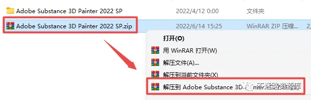 2.选中下载的压缩包,然后鼠标右键选择解压到“Adobe Substance 3D Painter 2022 SP”(没有解压选项点这里)