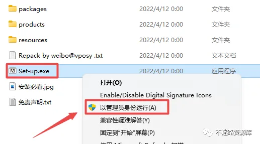 3.打开刚刚解压的文件夹,鼠标右键点击“Setup.exe”选择“以管理员身份运行”