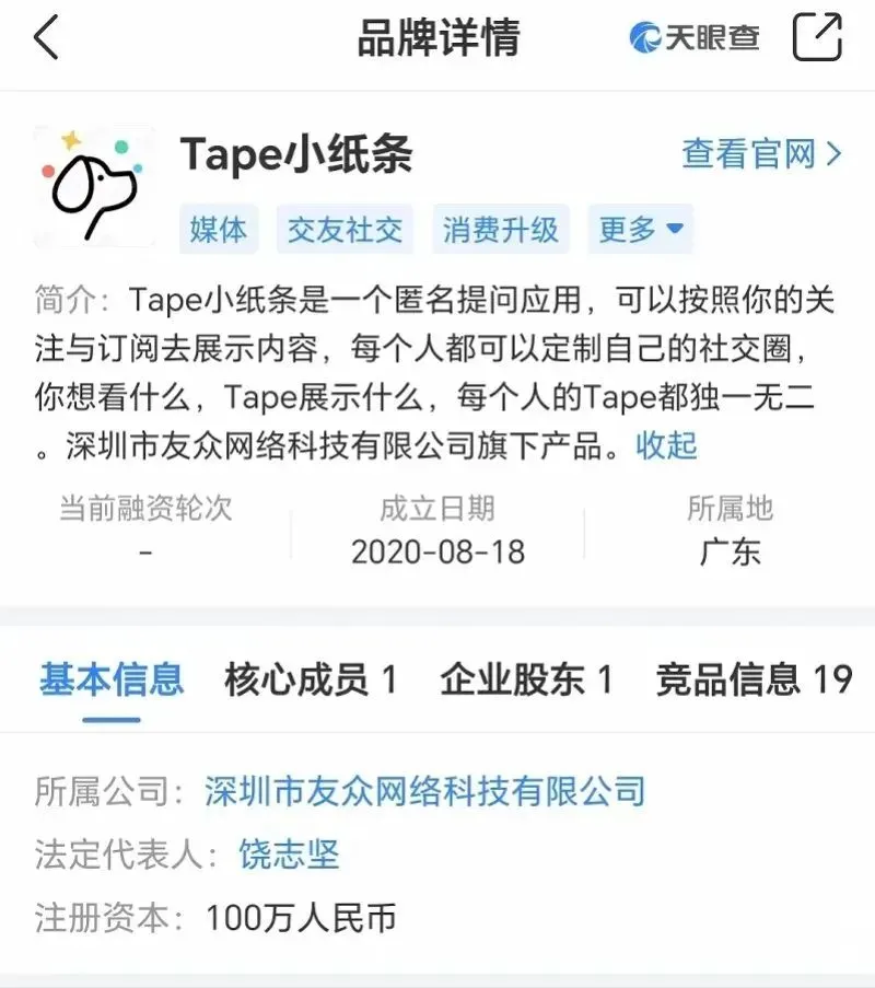 工商数据显示,不论是Tape小纸条时期的运营主体深圳市友众网络科技有限公司,还是轻盐时期的运营主体山东庚辰义成网络技术有限公司,都并未公开接受过投融资。