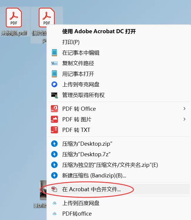 同样在右键菜单,选择多个文件后右键→在Acrobat中合并文件