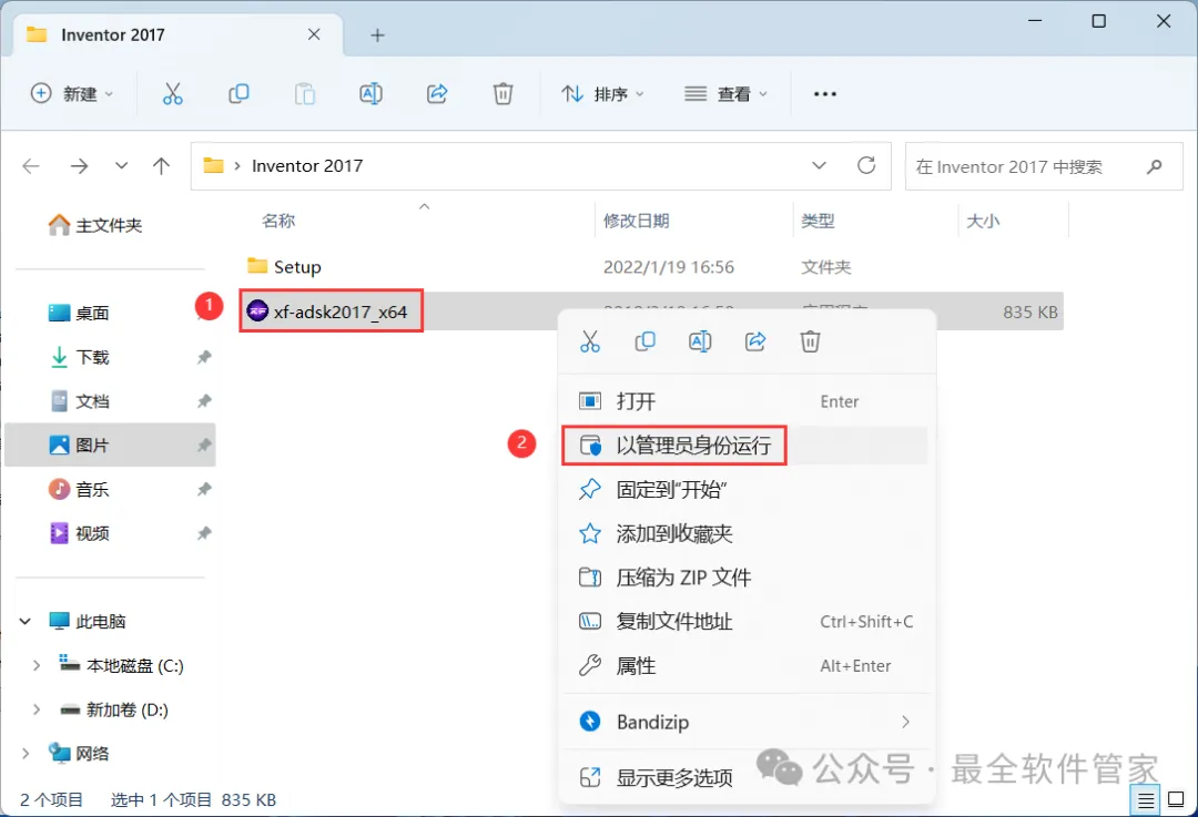 21、回到Inventor 2017文件夹,找到【xf-adsk2017】程序,右键选择【以管理员身份运行】它