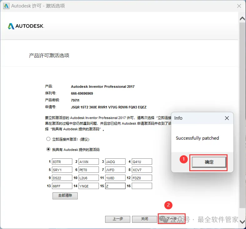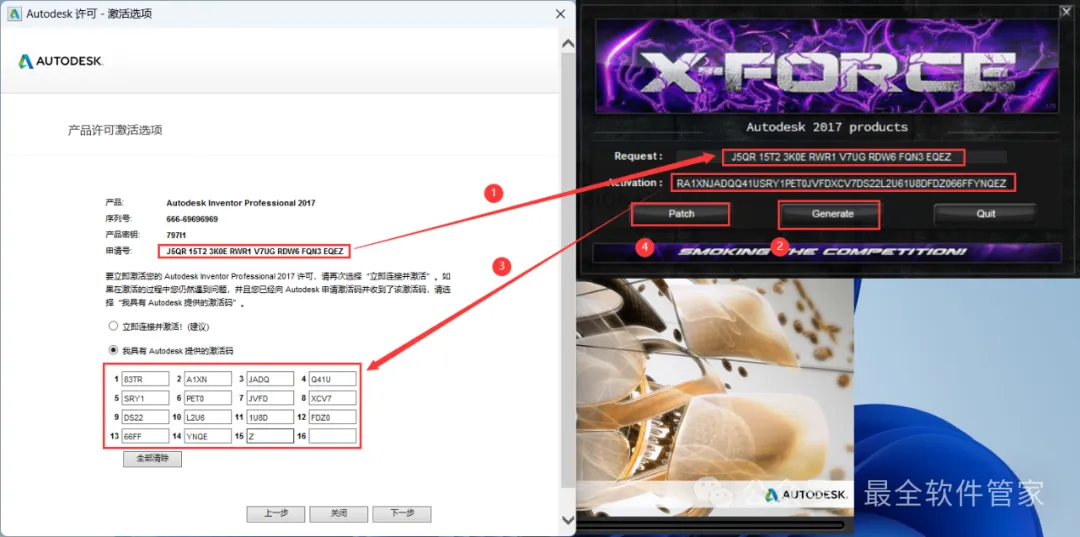 22、打开软件界面,将软件的【申请号】填入到程序的【Requset】内,再点击【Generate】,将程序的【Activation】填入到软件的【激活码】内,再点击【Patch】