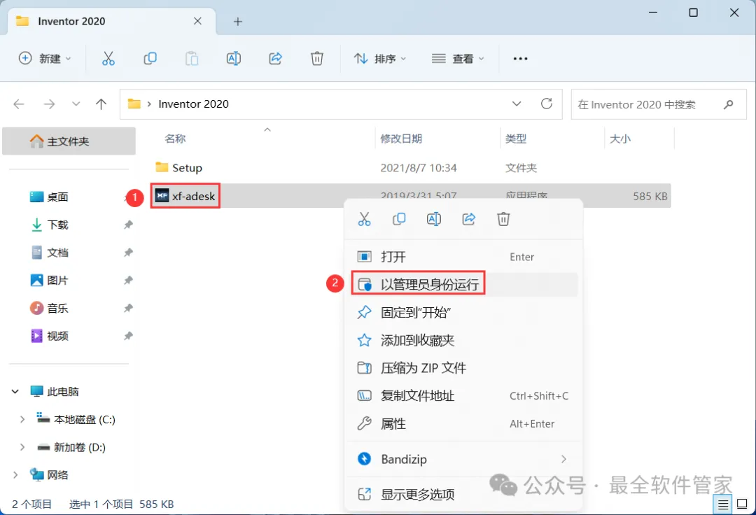 20、回到Inventor 2020文件夹,找到【xf-adesk】程序,右键选择【以管理员身份运行】它