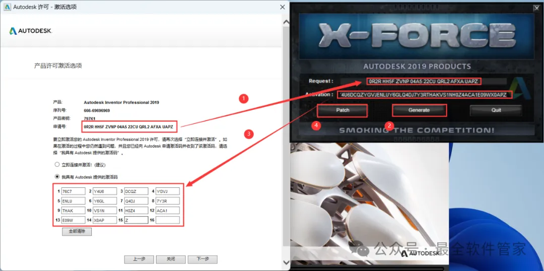 21、打开软件界面,将软件的【申请号】填入到程序的【Requset】内,再点击【Generate】,将程序的【Activation】填入到软件的【激活码】内,再点击【Patch】