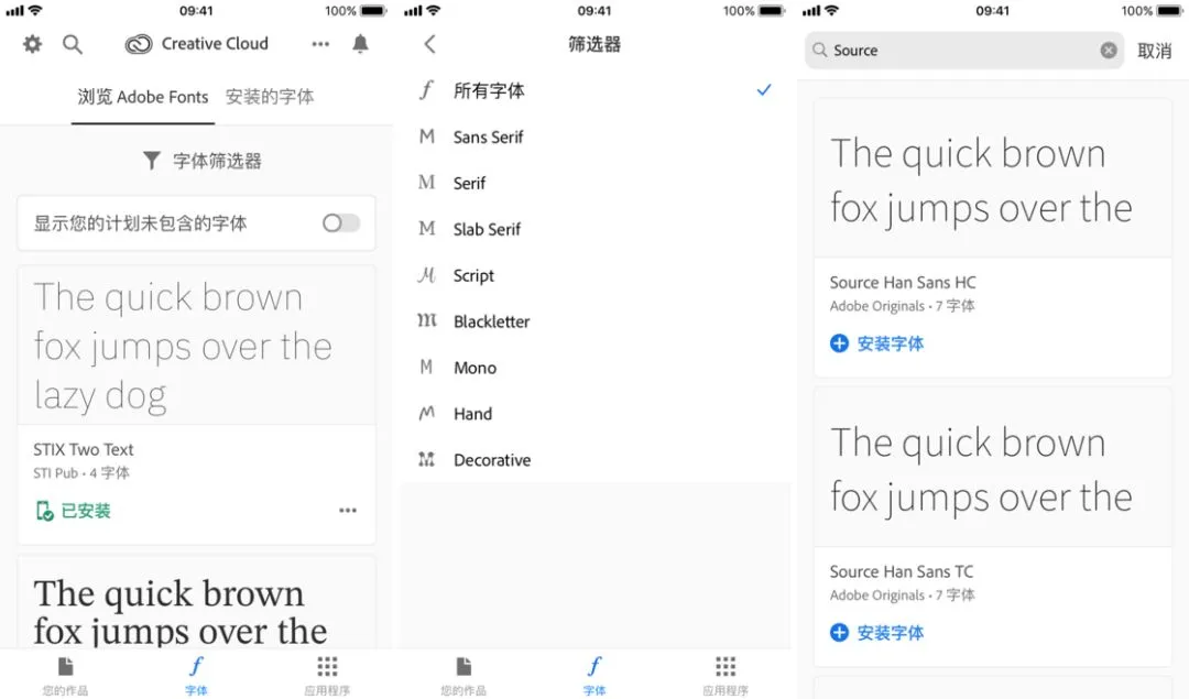 除了发布 iPadOS 版 Photoshop,Adobe Creative Cloud 应用也紧跟 iOS 的脚步,推出了深色模式和字体安装功能。在订阅 Adobe Creative Cloud 计划后,你可以安装多达 17000 种字体。即使你没有订阅,应用提供了免费的 1300 种字体也足够日常使用。