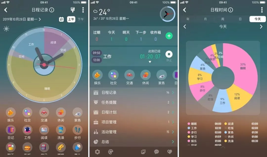 「知行日程」最大的亮点就是它的时间饼图。不同于传统的「时间线」,时间饼图更像是一个时钟,你可以将其划分为不同区域,直观地看到当前要做的事情。当然,应用也支持以传统的日历或列表视图查看日程,并且有详细的图表分析功能,在保持简单易用的同时,也能满足专业用户的需求。