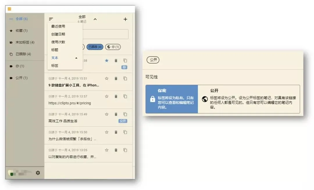 除了做好跨设备的复制粘贴功能外,Clipto Pro 同时提供了极为全面的剪切板管理功能。在 Clipto Pro 中,每一条复制记录都被视作是一条笔记,我们可以随意对笔记中的内容进行更改、删除、合并、收藏等操作,通过「标签」进行笔记分类管理也不在话下。它甚至允许我们将标签设置为「公开」或是「私密」,「公开」标签下的内容能够以链接的方式分享给他人,以供他人查看,仅我们拥有对内容的编辑权限;「私密」标签下的笔记内容则仅供我们自身进行查看和编辑。Clipto Pro 还支持多种排序方式,如:创建日期、使用次数、标签等,方便用户进行内容查找,因此我们可以将一些常用信息保存在其中以便随时随地调取。