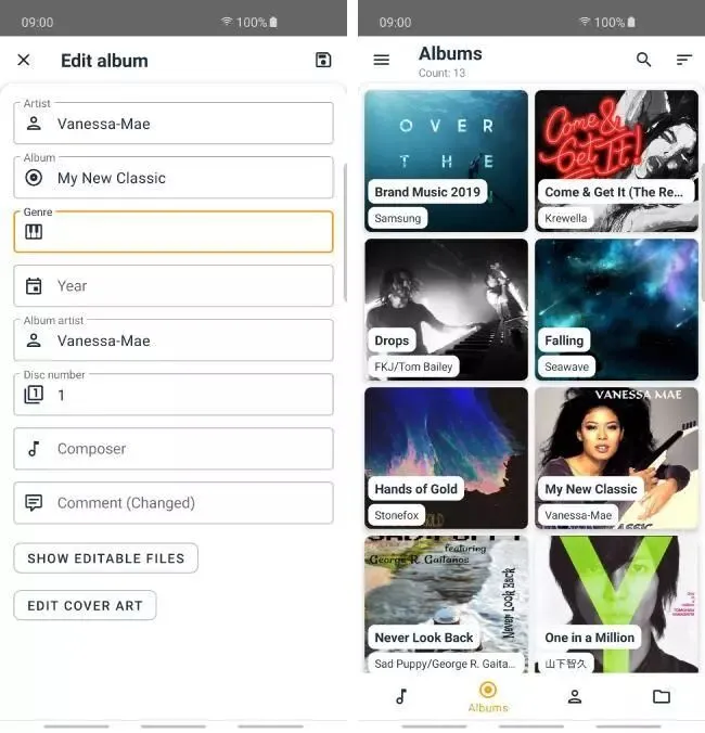 AutoTagger 采用 Material Design 2 设计风格,圆角更大、卡片层次感更加明显,不得不说这样的设计风格实在是很讨人喜欢。通过「音轨」栏进入音乐就能直接单独查找或编辑某一音频文件的标签及歌词等,通过「专辑」或者「作家」栏则可以批量更改流派、年份等具有相同属性的标签。AutoTagger 本身是带有音频播放功能的,但经过实测,在播放音频文件时出现了「不能读取」的问题,可能需要更新来解决。