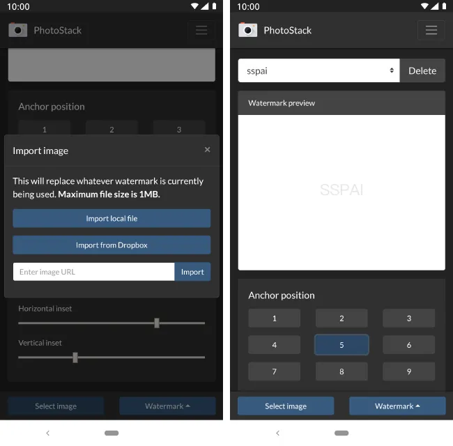 值得一提的是,在进行水印或图片导入时,我们既能从本地文件当中选取图片,也可以通过 Dropbox 乃至 URL 导入图片。