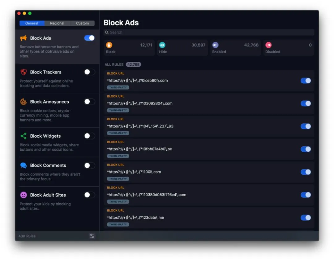 1Blocker 使用了 Safari 内置的内容过滤接口,所以能在保护隐私的前提下尽可能地降低对浏览器性能的影响。官方宣称,1Blocker 不会降低 Safari 浏览器的速度。虽然我很喜欢新版 1Blocker,但遗憾的是其并没有加入针对中国地区优化的 Easylist 规则集,这就导致在国内的使用效果并不如 AdGuard 等同类产品。