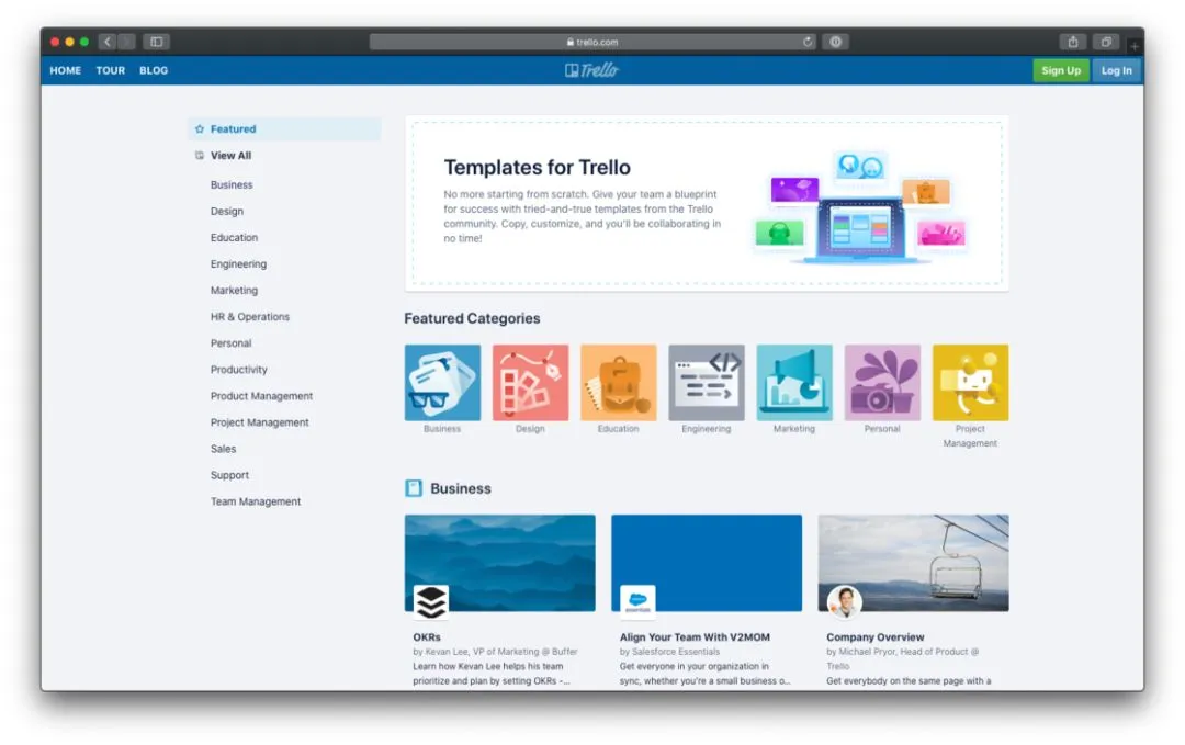 Trello Templates 是 Trello 新推出的模版页面,其囊括了销售、市场、工程、教育等 13 个大类近百项模版,方便用户快速开始一项看板任务。举例而言,很多公司都在执行 OKR 的员工绩效考核制度,那么 OKRs 模版就可以非常方便地应用在每个季度前,开始新的团队和个人目标制定。