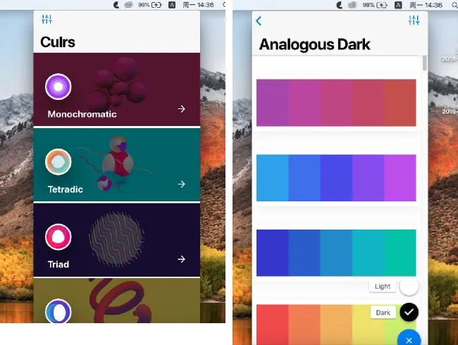「双色」和「三色」的搭配基本上与色轮位置有关,应用会通过色相、饱和度等方面给出色彩搭配方案,同样也提供明暗两种方案。即使你是设计新手,对色彩搭配知识尚不「敏感」,都可以在 Culrs 找到颜色「无脑」选择。