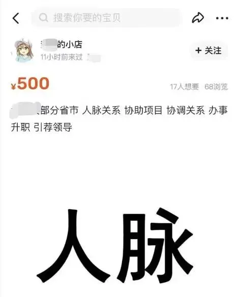 据报道,有网友爆料,在闲鱼等网络平台,有账号打着“协助项目、协调关系、办事升职、引荐领导”为名贩售所谓“人脉关系”,单笔售价少则数百元,多则达5000元。一个名叫“××高端人脉资源(实力)”的账号,近期更是发布了多条招揽生意的博文,涉及多个省份。