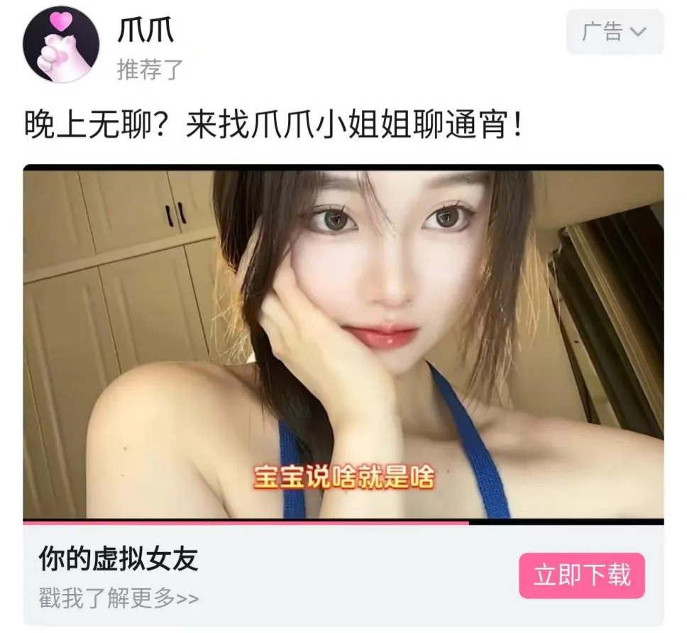 但或许是算法终于发现了我这条漏网之鱼,将我写入了收割名单,又或许是因为我基于乐子、困惑,以及一点点好奇心,在这些广告上投入了些许时间,使得最近一段时间里,交友软件广告在我的信息流里浓度直线上升。