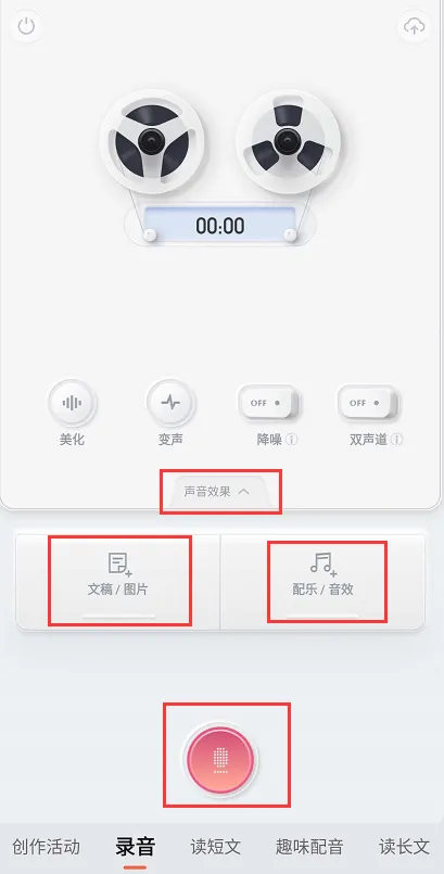 说明:中间红色按钮单击即开始录音,在“声音效果”处可以进行简单的声音处理。还可以输入将要录音的文字或者导入图片、PPT等,边观看边录音。