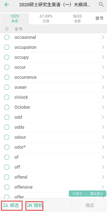 说明:考研英语这个模块囊括了很多单词本,同学们根据需要选择英语一和英语二的单词进行学习。勾选今日单词学习可以进行简单的设置”顺选“(按顺序背诵)与”随机“(随机背诵)。