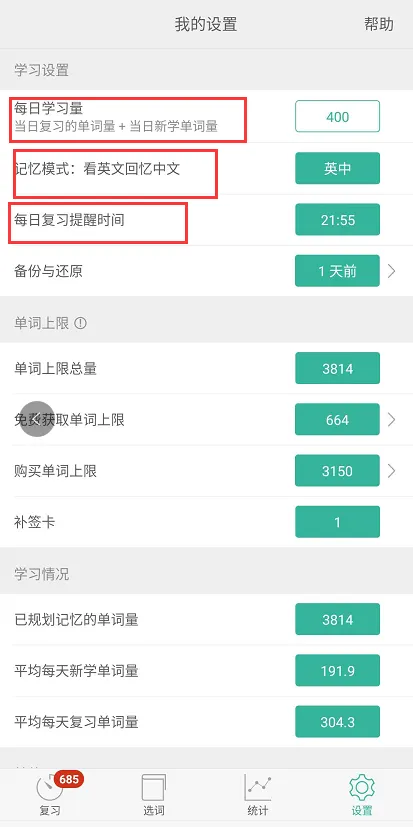 (第二步:“设置”菜单栏设置符合个人要求的学习量、记忆模式、复习时间等等)