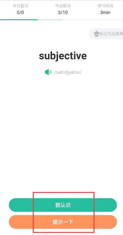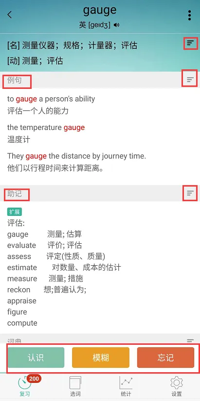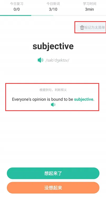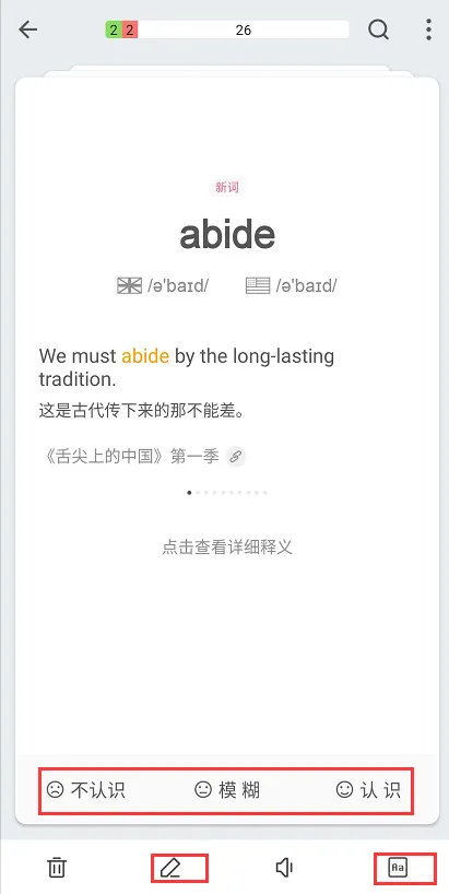 说明:图1可看见对单词的熟悉程度划分为三种情况:”认识“-”模糊”-“忘记”,大家需要慎重选择,因为这直接决定该单词后面出现的频率,而这是记忆的关键环节。