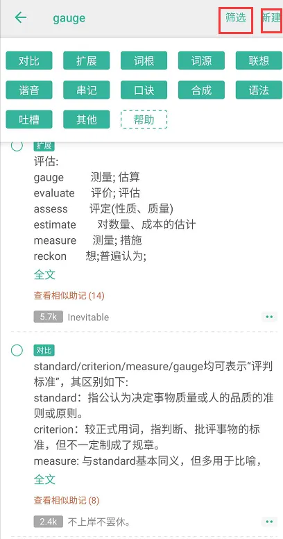图3可以新建自己对这个单词的个人理解,或者查看别人对这个单词的理解,通过筛选可以查看不同类型的助记,比如拓展助记可以查看这个单词的近义词等。