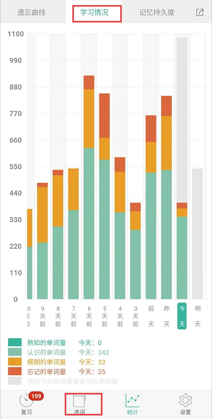 (第四步:查看自己背单词的情况,包含单词遗忘情况、单词学习情况、单词记忆持久度情况)