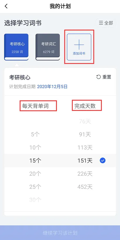 说明:在“我”菜单栏中的学习计划可以设置自己每天的单词学习数量以及完成天数,还可以添加词书。