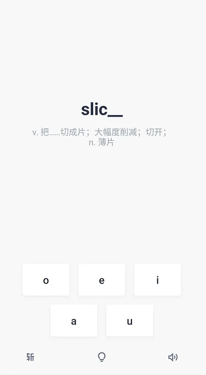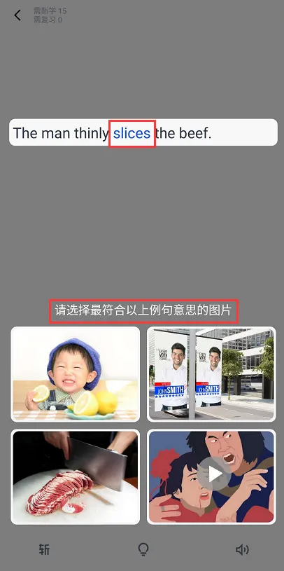 说明:百词斩是看图学单词的一个软件,在界面的下方会有3个小功能,如果你完全掌握该单词,可以点击左下角的“斩”这个功能,那么这个单词后续就不会再出现;如果你不懂例句也不认识单词,你可以点击中间类似于一个小灯泡的功能,查看答题提示(选错图片的情况下也可以查看句子的意思),右下角的小喇叭可以播放题目内容的发音。
