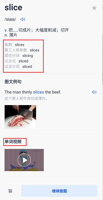 说明:具体单词的学习界面会把单词单复数、过去式、分词形式等等呈现出来,记忆不够深刻的宝宝还可以点击相应的视频观看,加深印象。点击“继续做题”就开始下一个单词的学习。