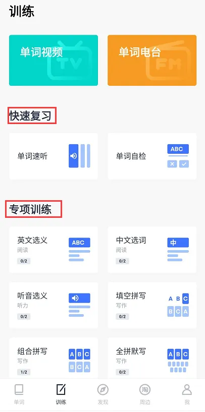 说明:此处有快速复习和专项训练两个板块,快速复习板块分为单词速听(听单词、例句的发音)和单词自检(是否记得单词)
