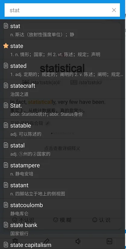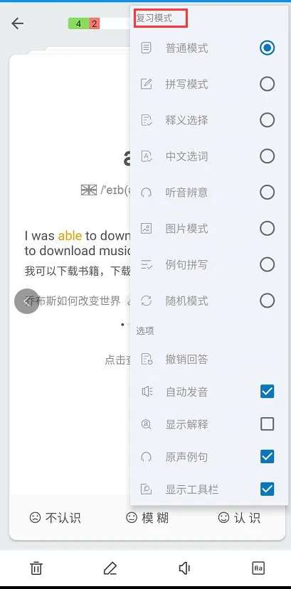 欧陆词典可以设置单词的复习模式,图1是单词复习的普通模式(对单词的三种熟悉程度,即不认识-模糊-认识),宝宝们可以根据需要设置为拼写模式、释义模式、中文选词模式等等,图2展示了各种复习模式,在界面的最下方有4个小功能,针对太简单的单词可以删除,可以单词进行注释,播放单词的英文朗读,对单词进行详细的释义。