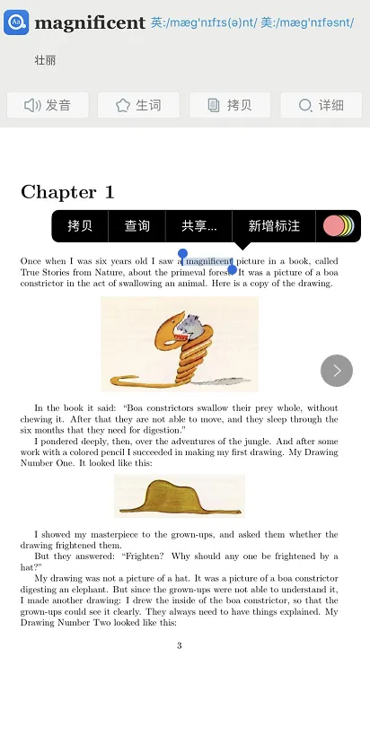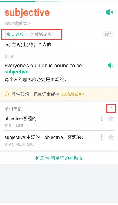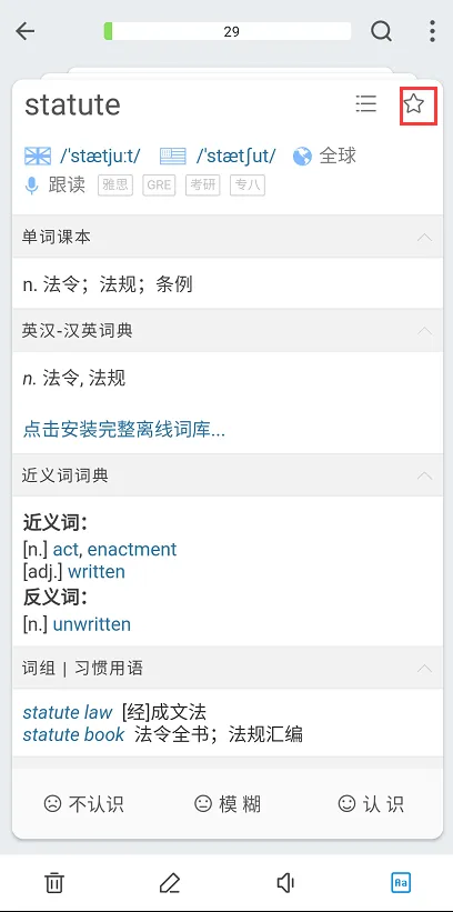 当宝宝们对这个单词比较陌生或者想查看更多的的信息的时候,单击图1的空白处(点击查看详细释义),界面会跳转至图3,此处可以查看关于这个单词更多、更丰富的资源,右上角的星星收藏图标可以将这个单词以生词的形式进入“生词本”,你还可以自己做一些标记。