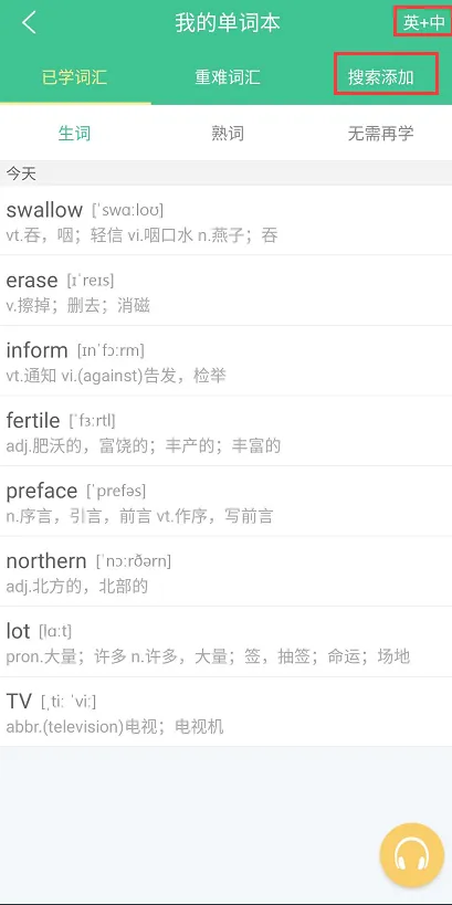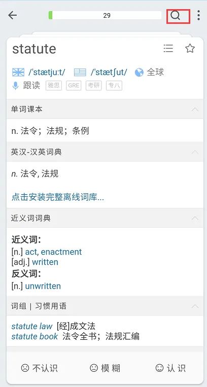 说明:在单词学习的界面的右上角有一个搜索框,点击即可查询相应的词根词缀及其衍生的单词。