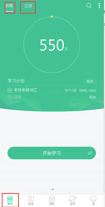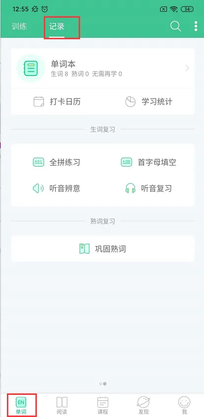 说明:在“单词”菜单栏的记录板块可以查看自己记单词的情况,以及生词本。